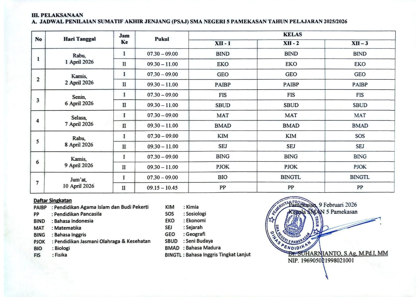 PSAJ dijadwalkan dari tanggal 1 – 10 April 2026. dengan pengaturan 1 ruang terdiri dari 20 siswa dan 1 orang pengawas ruang